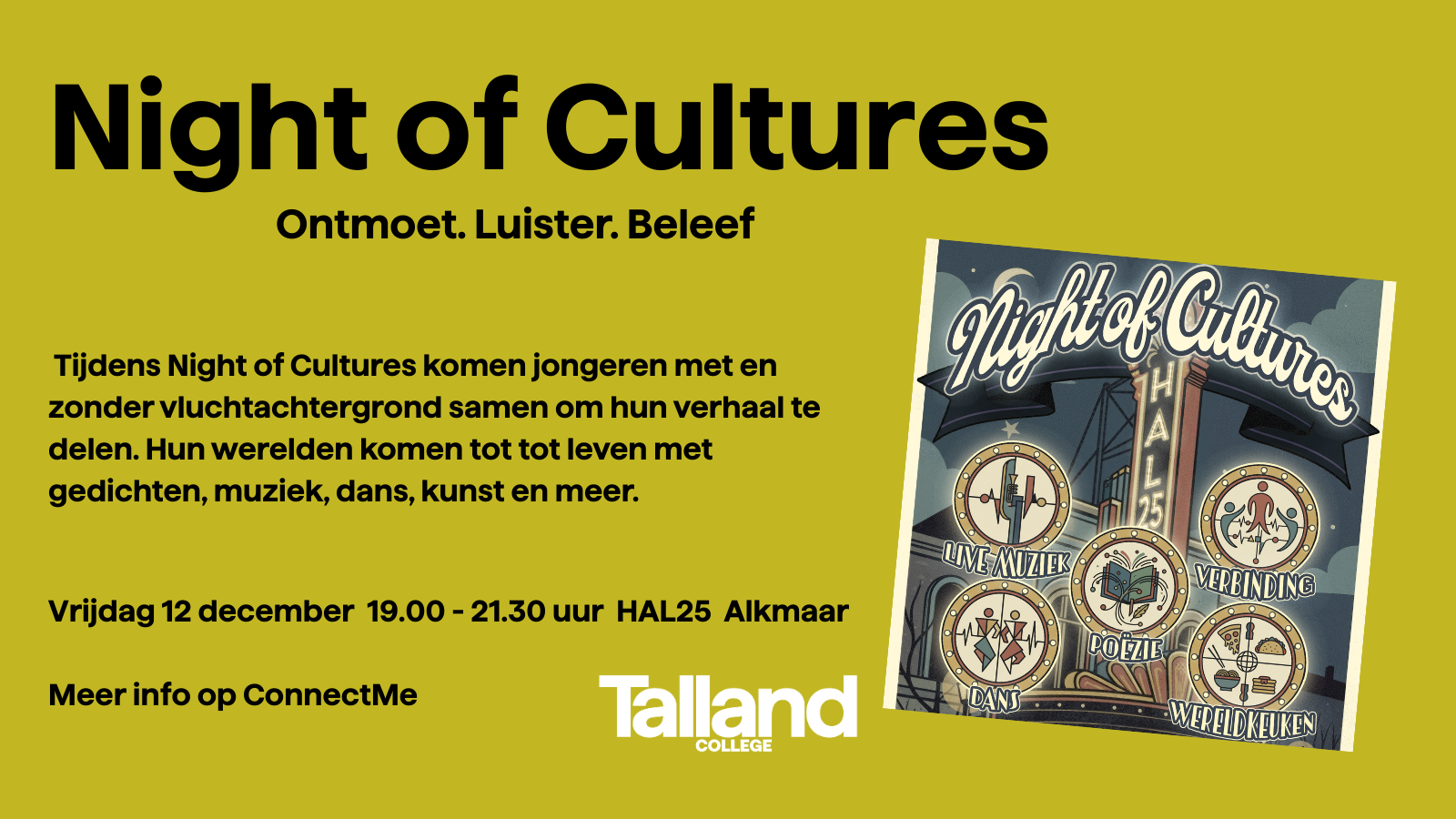 Tijdens Night of Cultures komen jongeren met en zonder vluchtachtergrond samen om hun verhaal te delen. In Hal 25 die omgetoverd word in een oud theater. Met een warm, echt en een tikje rauw gevoel brengen ze hun wereld tot leven met gedichten, muziek, dans, kunst en meer.